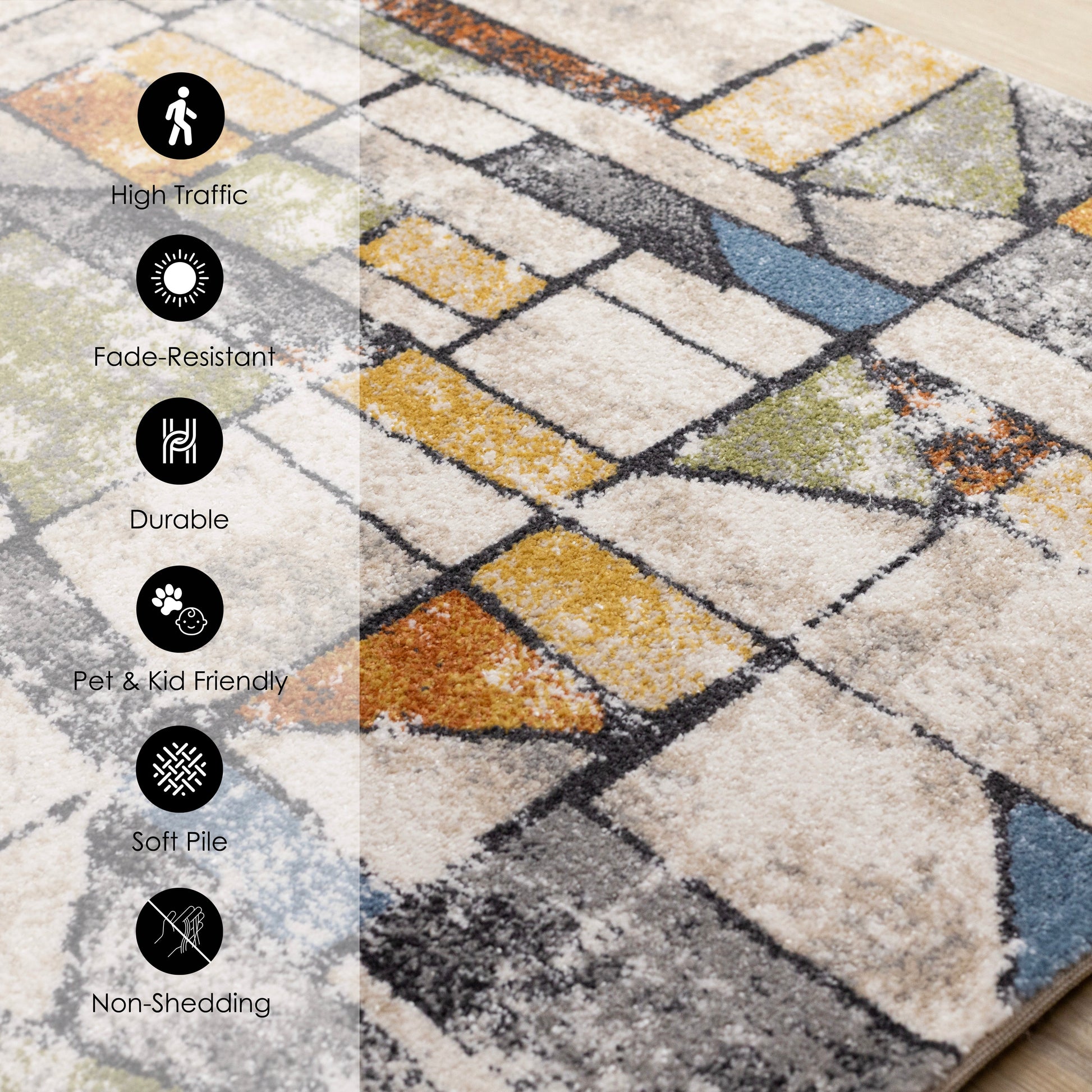 The Swift collection features distressed geometric designs in grey, white and taupe tones. Soft to the touch with its durable frieze pile. Is sure to add a modern contemporary ambience to your space.